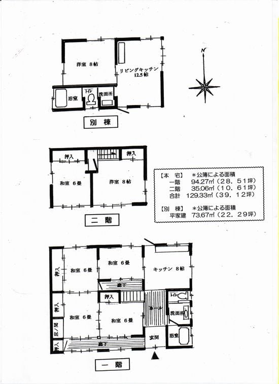 本宅:6DK 洋室8帖(一部屋)、和室6畳(5部屋)、キッチン8帖、洋式トイレ 別棟:2LDK リビングキッチン12.5帖、和室8畳、洋式トイレ |